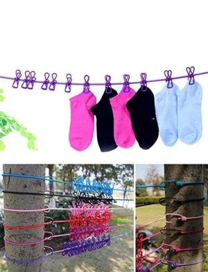 Cloth Drying Rope with 12 Clips, (2 Piece Combo) Multicolour (Free to Add Few More Clips)